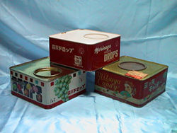 ばら売りが主流だった当時は、このような大きな缶で仕入れてふたつきのガラス瓶に